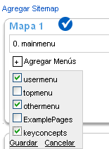 Este primer mapa sólo tiene seleccionados para ser mostrados los ítems del "mainmenu", pero podemos añadir que muestre la navegación de otros menús, por ejemplo: "usermenu", "othermenu" y "keyconcepts". Una vez seleccionados le decimos al sistema que guarde esta elección, claro, con el comando "Guardar" que aparece justo debajo de la relación de menús del sitio web.
