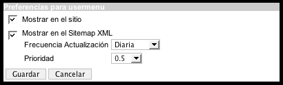Con cada uno de los menús seleccionados se pueden realizar varias operaciones: subir, bajar, quitar y opciones. Las tres primeras muy intuitivas, y la última para tomar decisiones de configuración, para particularizar si se muestra o no el menú, y si se activan las opciones XML y la frecuencia con que se actualiza y con qué prioridad.