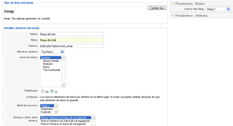 Damos un título al nuevo ítem, "Mapa del sitio", por ejemplo, y nos aseguramos de completar adecuadamente el campo "Select Site Map" de los parámetros básicos, con el que decidimos al crearlo.