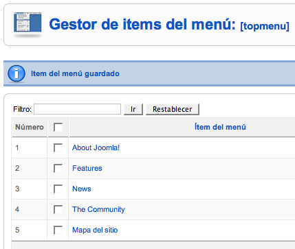 4 Accedemos a la gestión de los ítems de menú del menú "Top menu": Menús >> Top menú