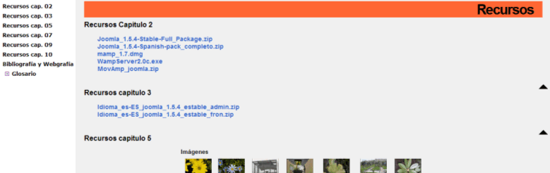 En la sección libros y web aparece una referencia de publicaciones relacionadas con Joomla! de calidad, así como una lista orientativa de la gran cantidad de espacios web dedicados a Joomla!