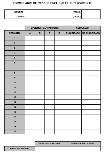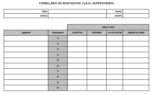 - Documento de registro y evaluación del profesorado. En este tipo de documento el profesor podrá anotar o recoger los resultados obtenidos en el mismo por los distintos participantes. Como ejemplo de este tipo de documento seguiremos con el del juego de "El superviviente".