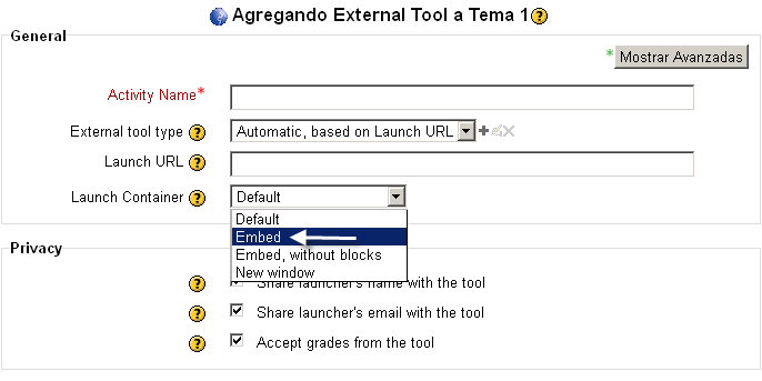La mayor parte de las opciones de configuración son comunes con las demás actividades pero las herramientas externas pueden verse incrustadas (embed) como parte del mismo curso o bien en una nueva ventana.