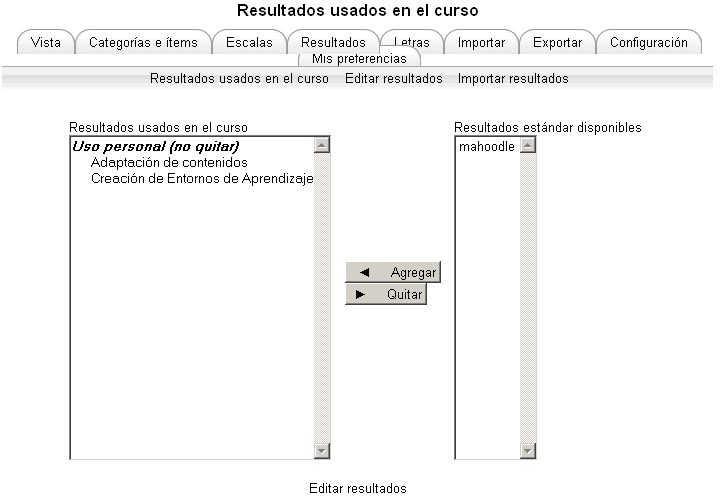 Outcomes (Resultados) es una función que permite definir lo que se espera en términos de competencias cuando el estudiante termina el curso o cada actividad. Ya existía en la versión 1.9 pero se amplía notablemente.