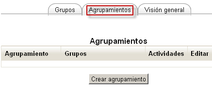 En Moodle 2.x aparece la opción Agrupamientos. Una agrupación es un conjunto de grupos que contiene a todos los usuarios integrados en cada grupo. Un usuario debe primero pertenecer a un grupo para luego poder estar encuadrado en una agrupación.