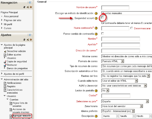Otra función que se ha añadido en Moodle 2.x es la de suspender la cuenta de un usuario desde Ajustes - Administración del sitio - Usuarios - Cuentas - Agregar usuario