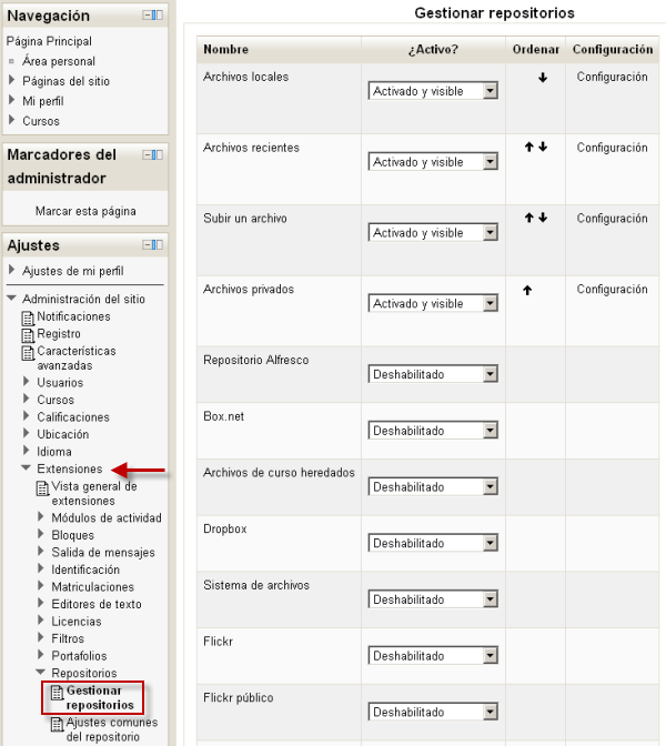 Hay que habilitar la funcionalidad de repositorios desde Ajustes - Administración del sitio - Extensiones - Repositorios - Gestionar repositorios