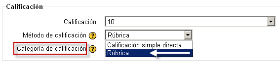 Para poder calificar con una Rúbrica debemos acceder a la misma desde Categoría de calificación.