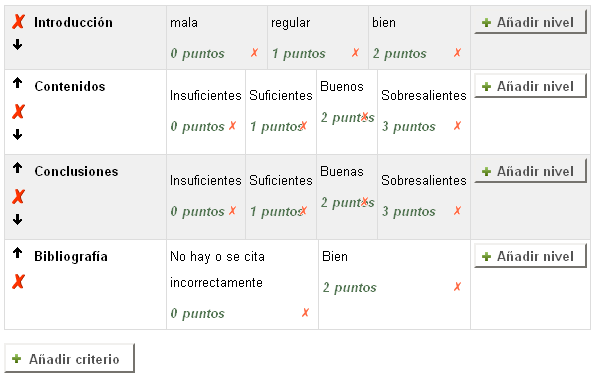 Si queremos eliminar un criterio basta con pulsar sobre la X que aparece junto al nombre del mismo. De forma similar podemos eliminar niveles pulsando en la x que se muestra junto a los puntos otorgados al mismo.