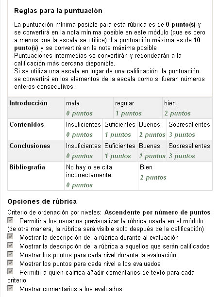 Utilizando las rúbricas es posible establecer diferentes criterios y asignar a estos distintos niveles, estableciendo un valor para cada uno de los mismos. Esta forma de calificar se define por medio de un plugin que contiene la forma de calcular la calificación. Este esquema de la calificación se guarda como una información propia de la actividad.