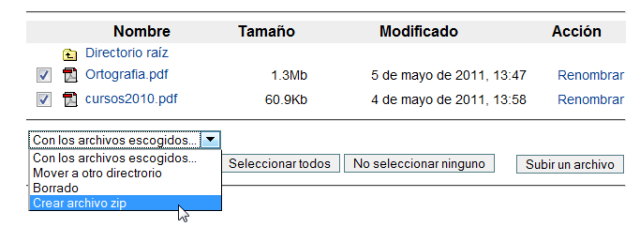 Una vez comprimido el archivo, tienes opción a descomprimirlo, a listar los archivos que contiene, a restaurarlo en otro lugar moodle o a renombrarlo. Sólo tendrás que marcarlo y elegir la opción que prefieras.