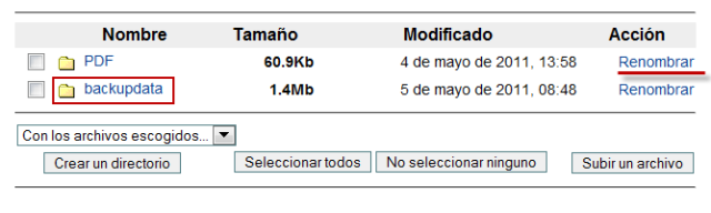 Ya has podido ver que, en cuanto hemos creado el directorio, nos ha aparecido la opción Renombrar. Podemos utilizarla si queremos cambiar el nombre de nuestro directorio pero, si ya hemos subido a la plataforma algún archivo incluido en ese directorio, tendremos que volver a hacer el enlace porque, al cambiar el nombre del directorio, hemos cambiado el nombre de la ruta y el sistema no encontrará el archivo.