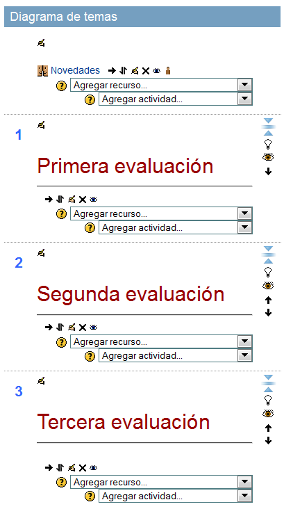 Para darte una guía, puedes utilizar los tres primeros temas de la página, uno para cada evaluación. De momento, puedes ir incluyendo recursos en cada una de las evaluaciones y, poco a poco, conforme vayas avanzando, añadirás a tu aula actividades, herramientas de comunicación y un calificador.
