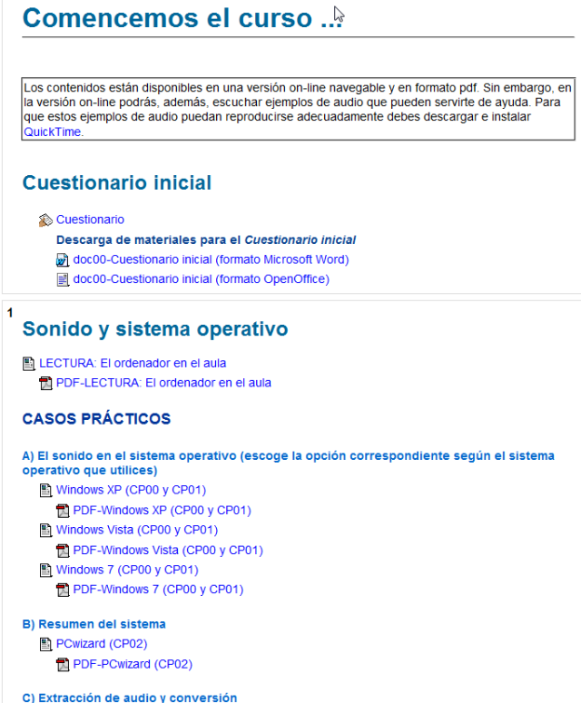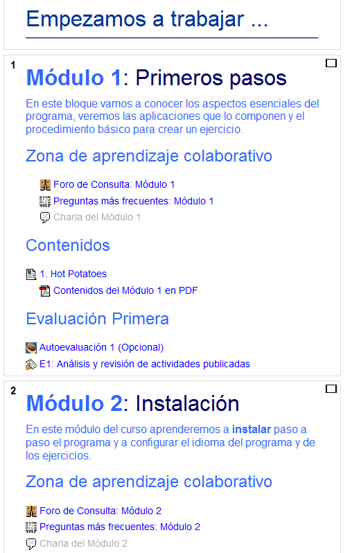 Aquí tienes dos ejemplos de algunos de nuestros cursos. Como verás, están divididos en módulos, en vez de evaluaciones y tienen distintas estructuras en cada módulo, según las necesidades didácticas.