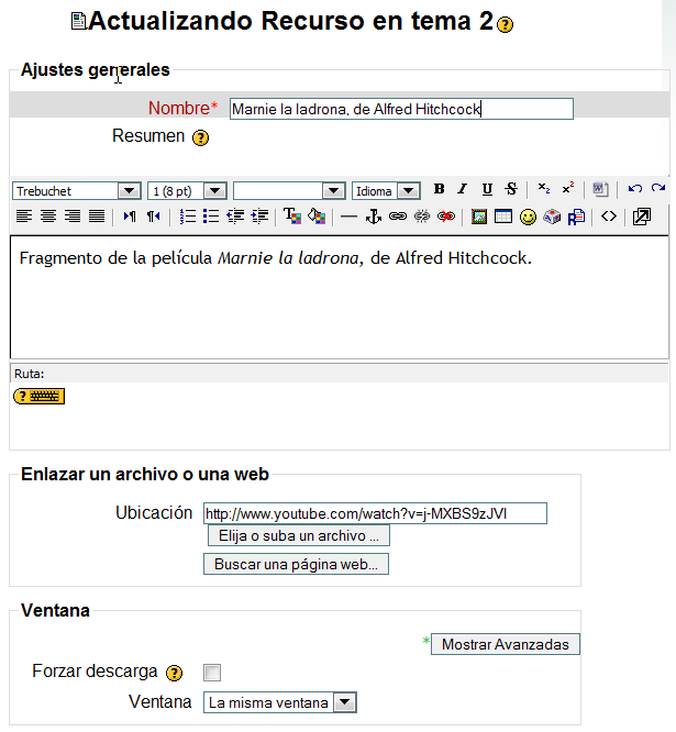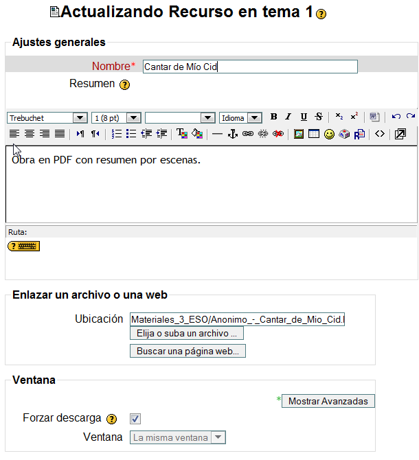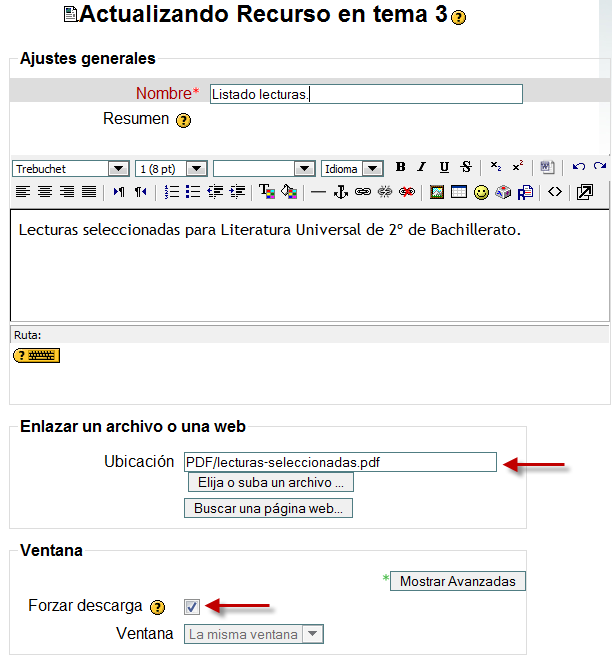 Como queremos dar la posibilidad de que se descarguen un documento de nuestra página de Moodle, conviene que activemos Forzar descarga; así, al seleccionar el documento, se tendrá la doble opción de Abrir o Guardar archivo: