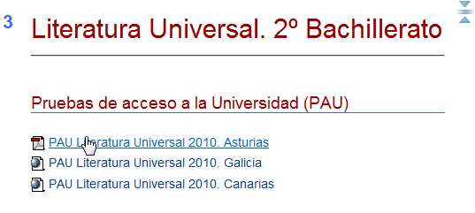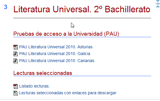 Para los alumnos de 2º de Bachillerato podemos necesitar obras literarias en PDF y pruebas anteriores de la PAU (Prueba de Acceso a la Universidad) para conocer su estructura.