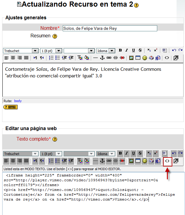 El propio vídeo nos proporciona el código embed. Si hacemos clic en el icono, accedemos al código. Lo copiamos y lo pegamos, abriendo el código HTML en nuestro recurso Editar una página web:
