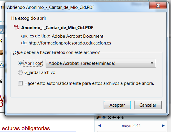 Recomendamos forzar la descarga para que se tenga opción a Abrir o a Guardar. El archivo se ha guardado en el directorio PDF, pero podría haberse creado otro para los materiales de Literatura Universal, por ejemplo.