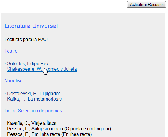 Para facilitar las lecturas podemos optar por ofrecer un listado en documento PDF, es decir, como recurso Enlazar un archivo o una web,