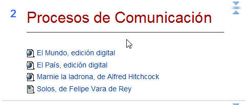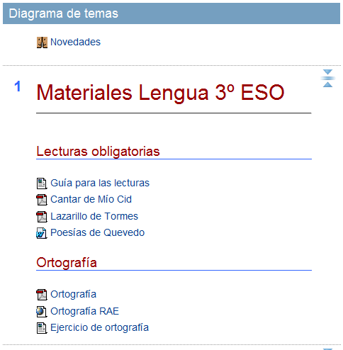 Si pensamos en un profesor de Lengua y Literatura, que da clases de Lengua Española en 3º ESO, la optativa de Procesos de Comunicación en 4º ESO y tiene un curso de Literatura Universal en 2º de Bachillerato, podríamos habilitar un tema para cada nivel y albergar allí los recursos que queremos mostrar a nuestros alumnos.