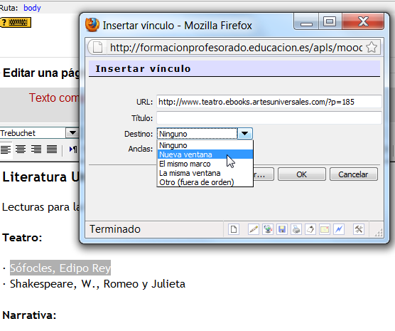 También podríamos enlazar a páginas web donde puedan ser descargadas algunas de las obras en PDF, si lo consideramos conveniente. Para enlazar puede utilizarse el recurso Editar una página web, aunque también puede hacerse desde cualquier recurso que tenga editor HTML. El enlace a la web se editaría como ya hemos visto: