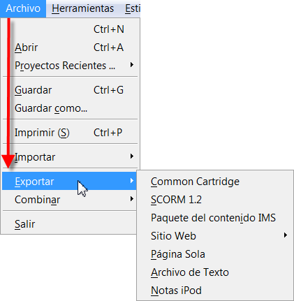 eXeLearning puede exportar los proyectos a formatos como IMS, SCORM, archivo de texto o página sola. La página web exporta el contenido a una carpeta autocontenida o comprimida.