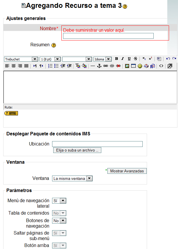 Sobre la ventana, es preferible dejar el recurso en la misma ventana, ya que aparecerá encuadrado dentro del marco de Moodle.