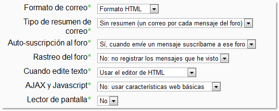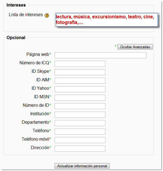 Podemos acceder a estas opciones tanto haciendo clic en el botón editar de la lista de usuarios, como a través de la pestaña editar información del perfil personal. Como esta información está detallada en el Módulo de gestión de usuarios, te remitimos a él para más información. Aquí sólo te mostraremos las pantallas que encontrarás al hacer clic en mostrar avanzadas.