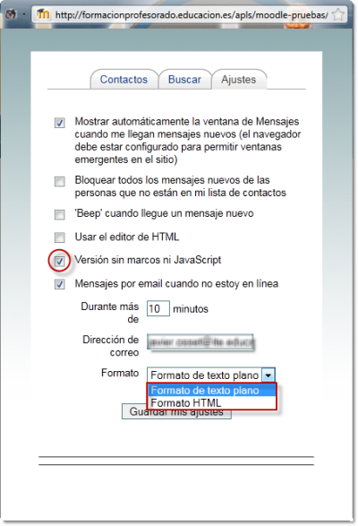Esta opción viene configurada por defecto. Cuando estemos en línea, o sea, en el curso, saltará la ventana de mensajes si nos entra uno nuevo, siempre y cuando hayamos configurado nuestro navegador para permitir ventanas emergentes en nuestro curso (navegador Firefox recomendado). -