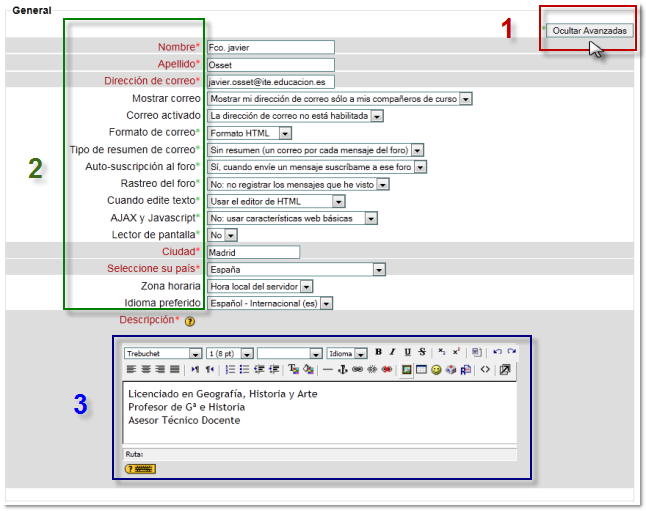 Como podéis ver, los campos marcados en rojo, son lo que Moodle solicita para activar a un usuario y son, por lo tanto, imprescindibles. Ya hemos visto que podemos ocultar nuestro correo electrónico a los demás usuarios, pero no podemos quitar este dato. Los demás datos no son obligatorios y algunos estarán ocultos hasta que activemos mostrar avanzadas. Y, sin embargo, algunos datos son fundamentales, tanto para los estudiantes como para el profesorado.