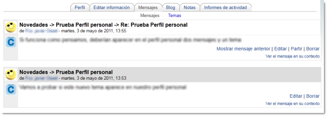 Desde esta pestaña, un usuario puede gestionar los mensajes y temas que haya incluido en cualquier foro del curso, pudiendo, además, añadir un tema o editar, contestar o borrar mensajes.