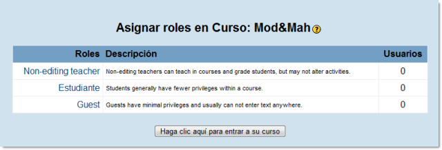 En efecto: profesor-no editor (que antes hemos llamado también tutor), estudiante e invitado. Ya hemos visto como asignar el rol de estudiante, pero podemos preguntarnos para que puede interesarnos asignar otros roles como el de invitado (guest).