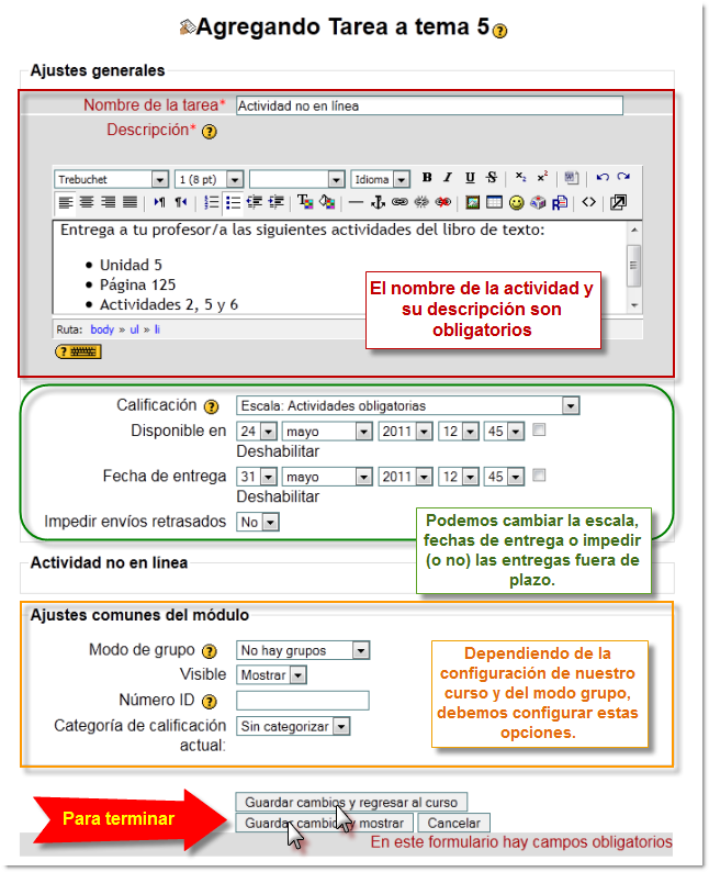 Por último hay que guardar los cambios y la tarea ya estaría disponible en el curso.