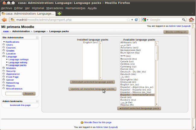 Para cambiar el idioma de nuestra Moodle tendremos que instalar el paquete del idioma Español - Internacional (es), para ello bastará con seguir estos pasos: