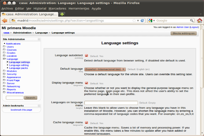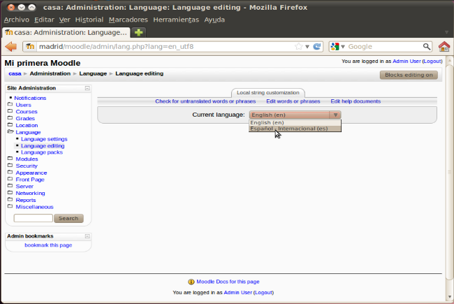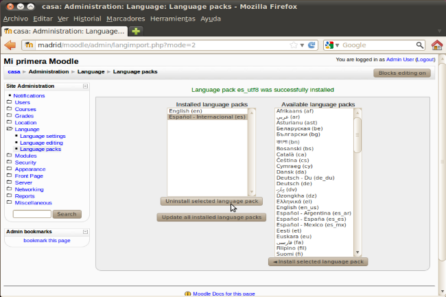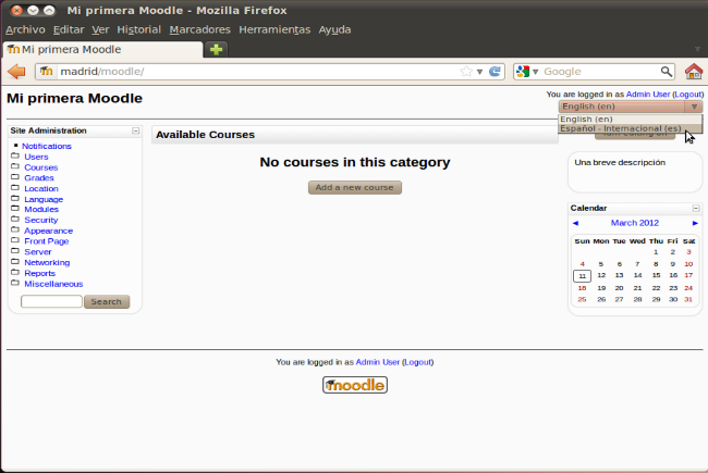 - Si eliges ahora Español - Internacional (es) tu Moodle se convertirá automáticamente a dicho idioma, tal como puedes ver en al figura siguiente: