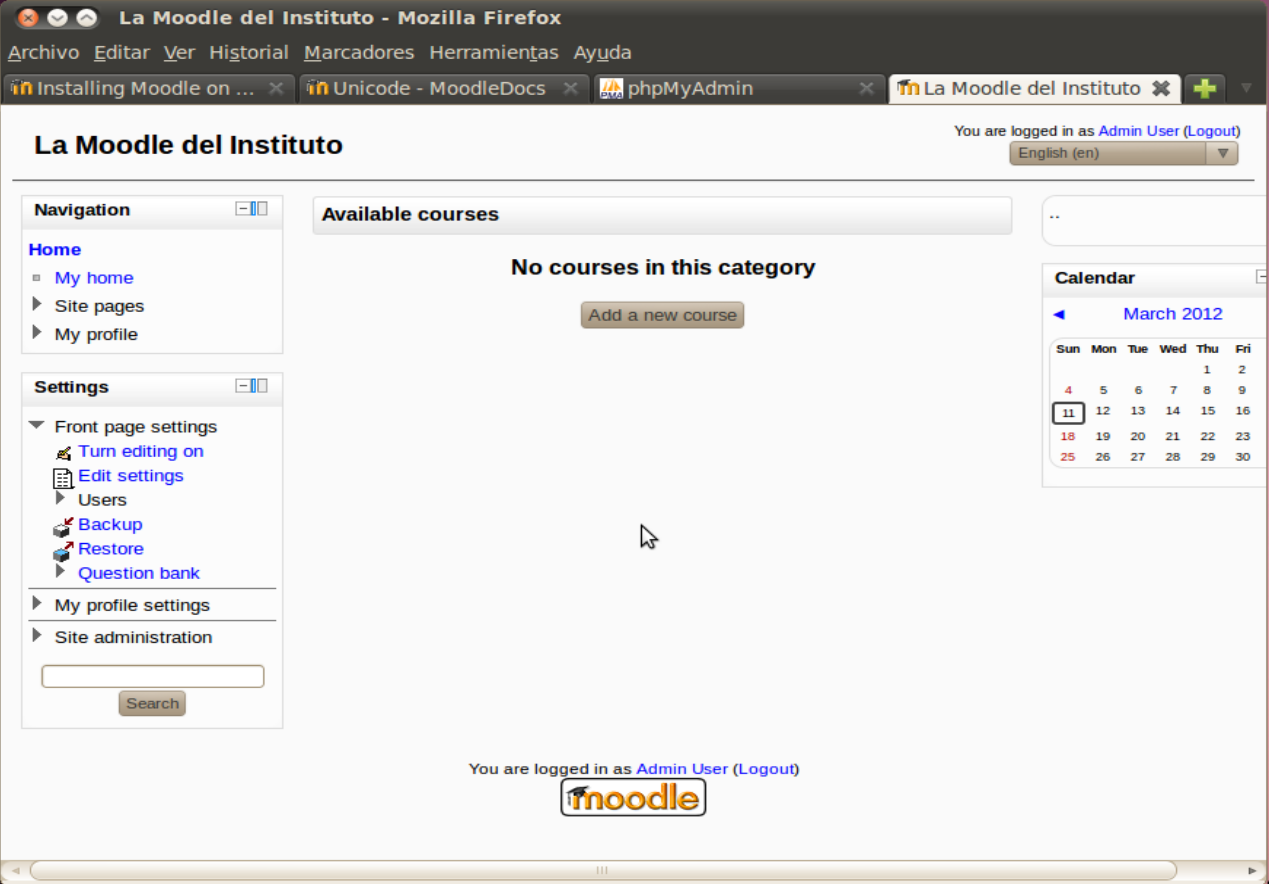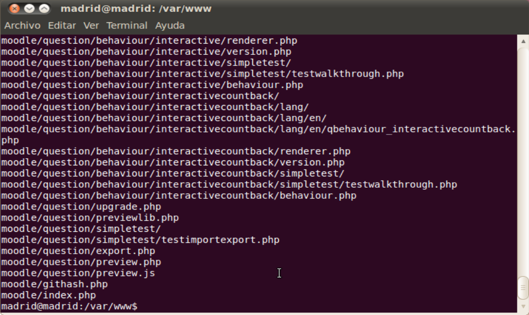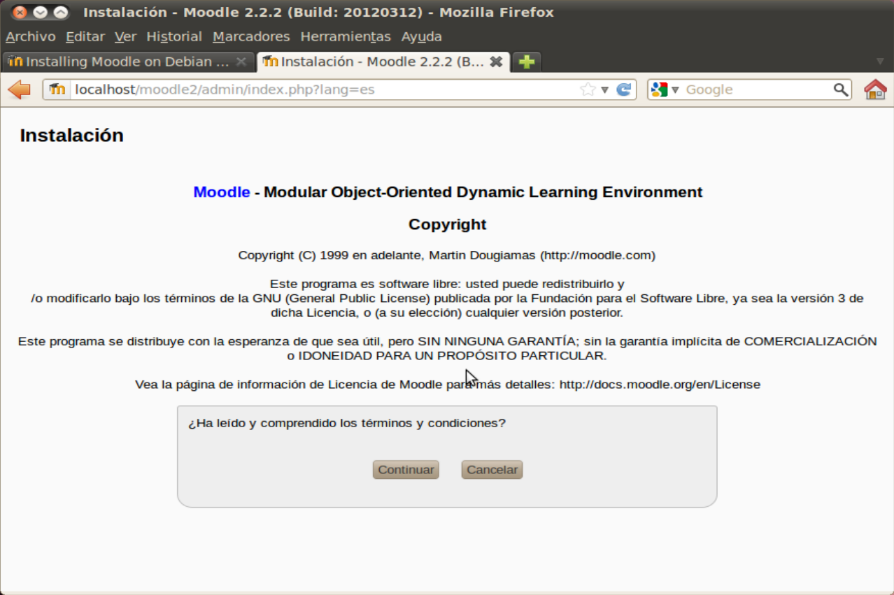 La versión actual de Moodle es la 2.2. En otras páginas de este manual se han instalado versiones anteriores, que, por otra parte, son plenamente vigentes, pero si quieres instalar el Moodle del "futuro" -que ya está aquí- esta es tu sección. Aunque ya sabes que nosotros, para esta ocasión, recomendamos las versiones 1.9.x.En este caso, no disponemos de paquetes para Moodle 2.x en los repositorios de Ubuntu, por lo que se tendrá que realizar una instalacion manual, tal como se describe en la documentacion oficial de Moodle, e y ademas lo haremos desde la linea de comandos de nuestra distribución basada en Debian, (Ubuntu o cualquier distribución autonómica española). Per no se asuste que es más rápido, cómodo y sencillo.