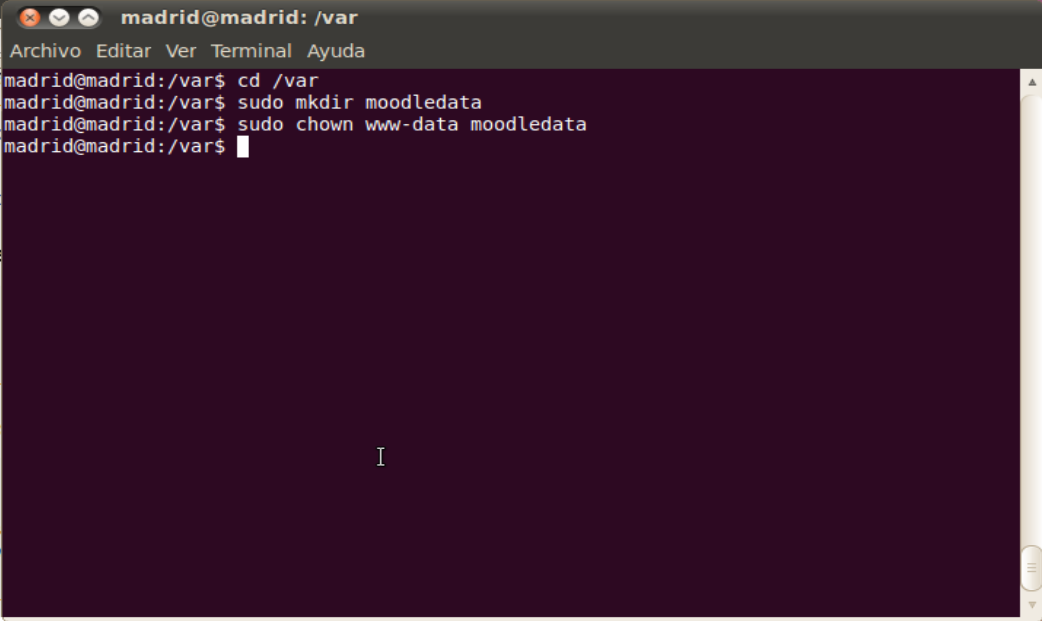 - Ahora crearemos y configuraremos el directorio moodledata mediante los comandos: