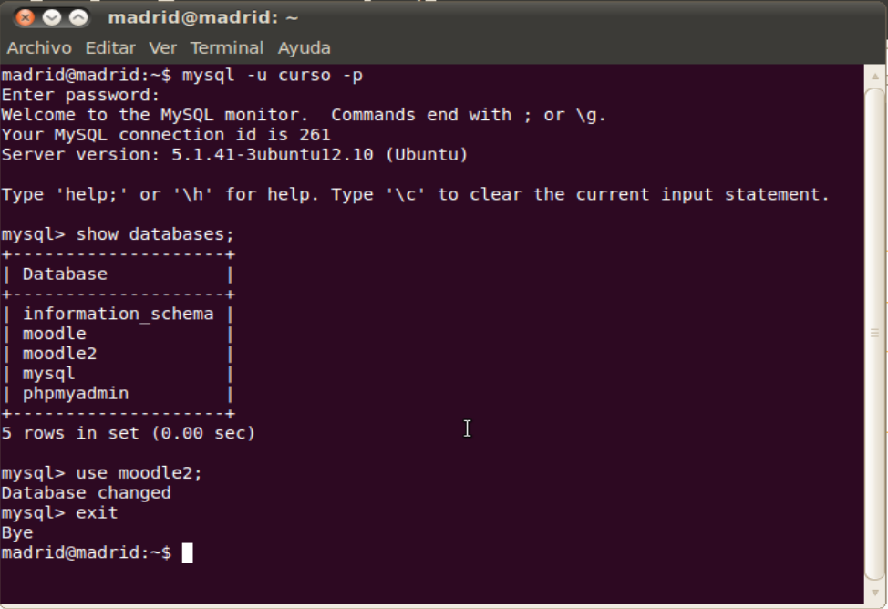 Ahora tendremos que crear una base de datos y un usuario mediante los siguientes comandos. Tengase en cuenta que hemos llamado a la base de datos: moodle2, al usuario de la base de datos curso y con contraseña intef:
