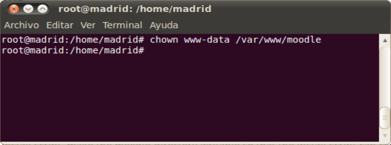- Ahora antes de ejecutar el script de instalación, haremos que se pueda escribir en el directorio de Moodle mediante el comando:
