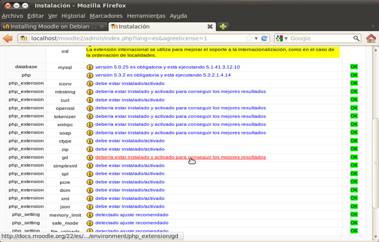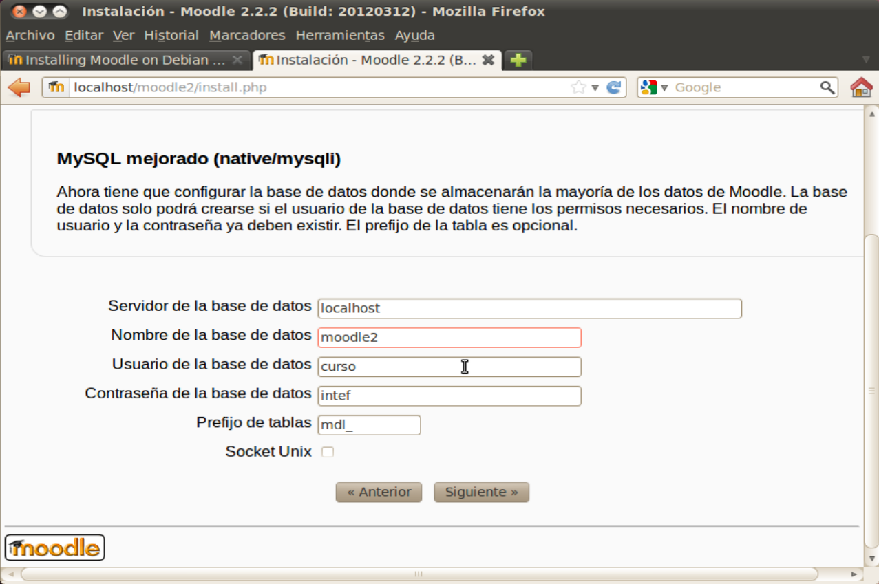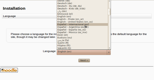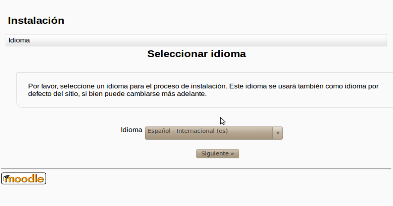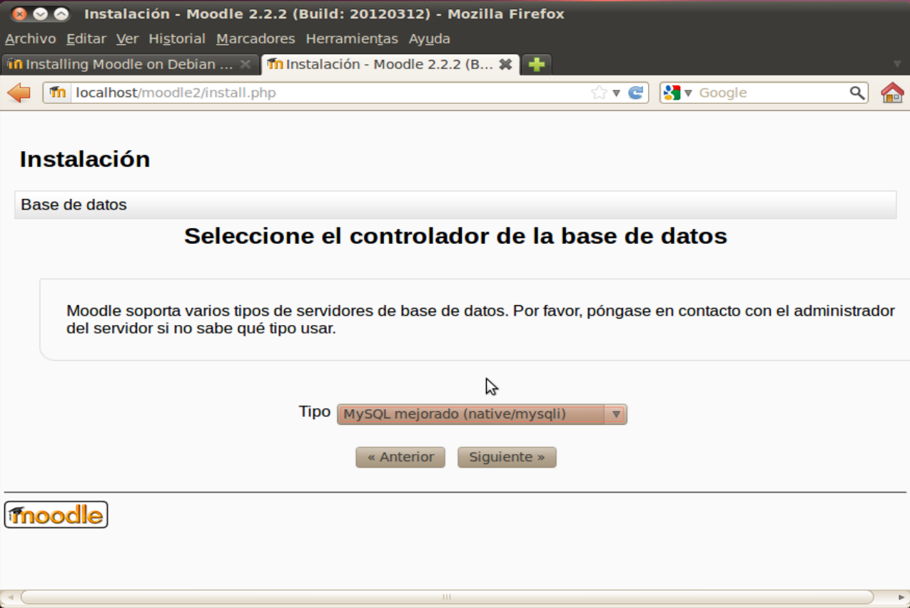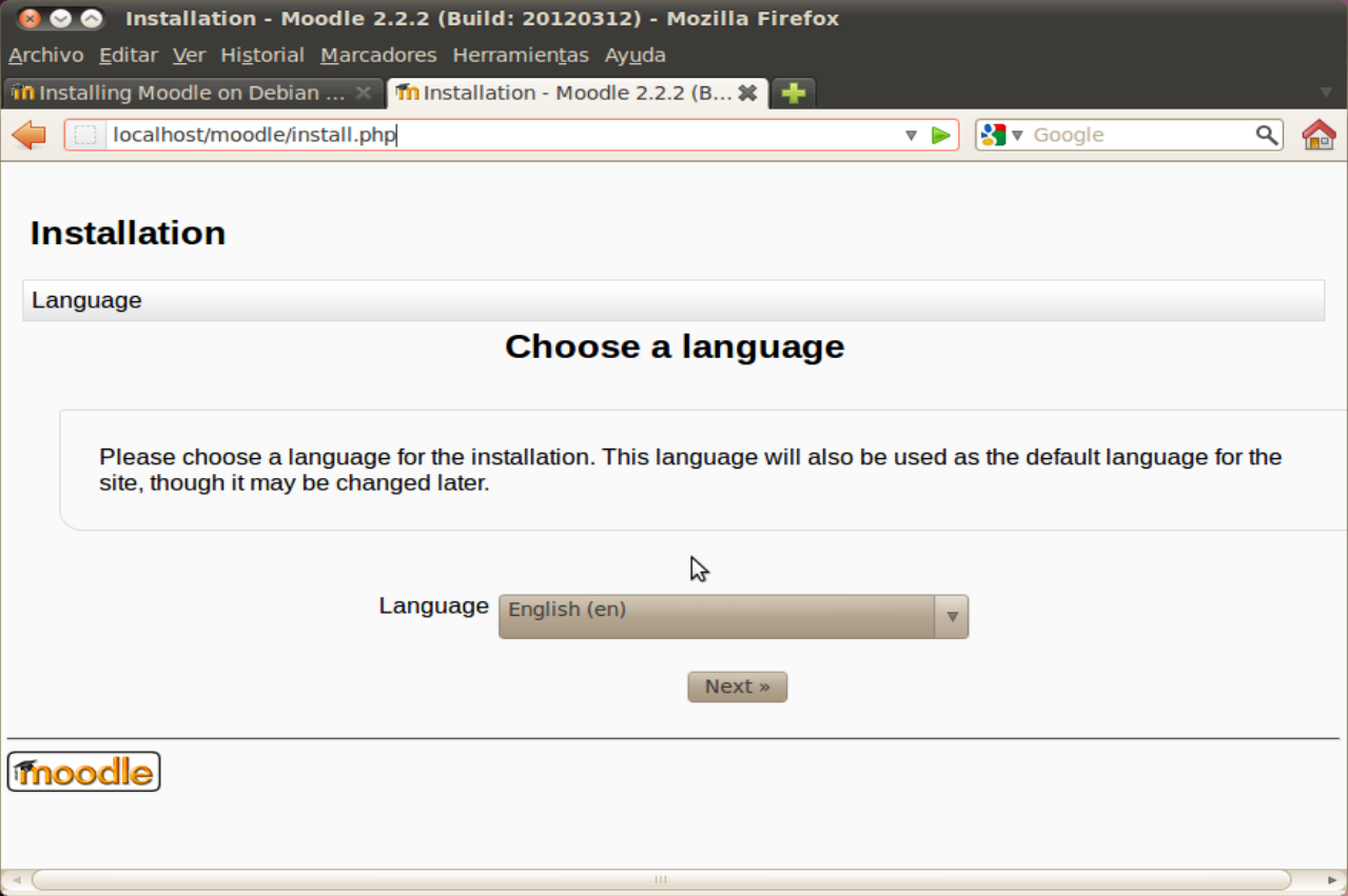 - Ahora ya podemos arrancar el navegador y escribir la dirección http://localhost/moodle y completar el proceso, tal como se muestra a continuación: