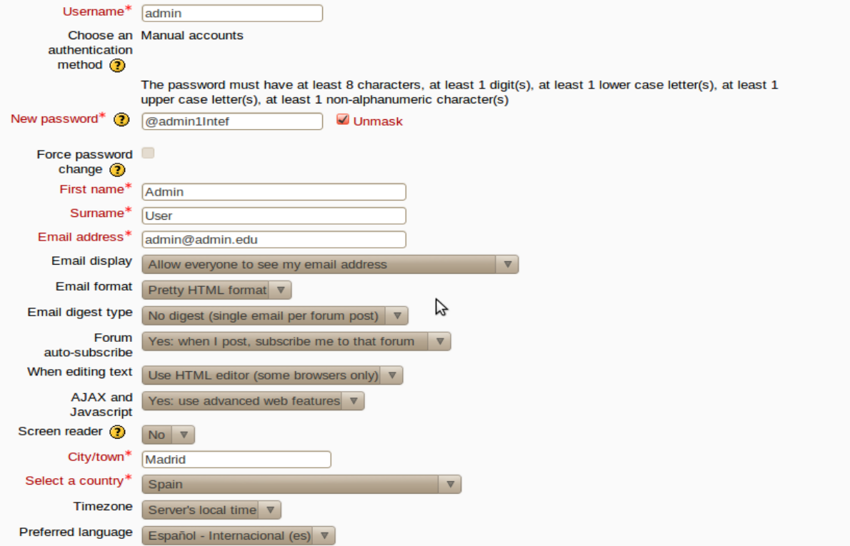 - configurar la página de administración, en este ejemplo al usuario por defecto admin le hemos asignado la contraseña @dmin1Intef.