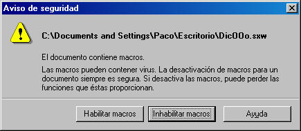 Una vez estén en el Escritorio hacemos doble clic sobre DicOOo.sxw y se abrirá OpenOffice con el siguiente cuadro de advertencia. |
