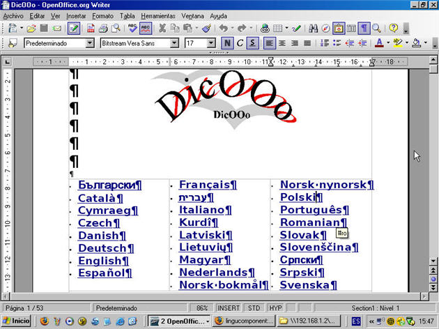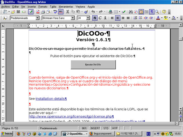 Nos dice que el domuento que intentamos abrir contiene macros y que las macros pueden contener virus. Efectivamente el documento que abriremos tiene macros y son esas macros las que nos interesan para la instalación de los diccionarios. Hacemos clic en el botón Habilitar macros y terminará de abrirse OpenOffice.org Writer que nos muestra la siguiente figura. |