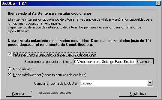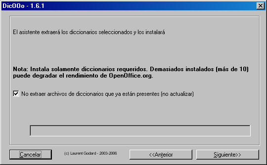 Si dejamos marcada la casilla No extraer archivos de diccionarios que ya están presentes (no actualizar), no se instalarán los diccionarios que ya tengamos instalados. Si ya tenemos instalado un diccionario y queremos que se actualice quitamos la marca de esta casilla. |