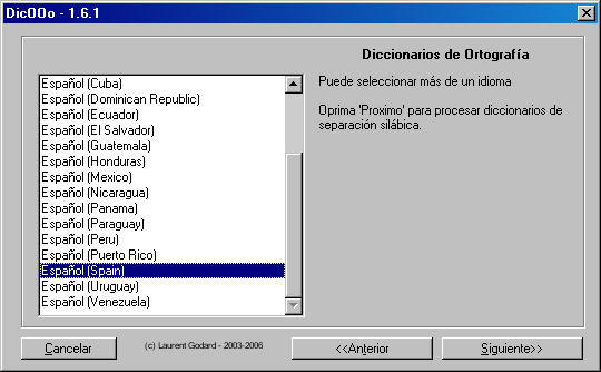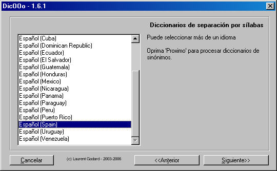 Seleccionamos en la lista Español (Spain) y hacemos clic en el botón Siguiente para ir al tercer paso del Asistente en el que nos mostrará una relación de diccionarios de separación silábica. |