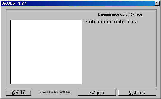Nuevamente seleccionamos la opción Español (Spain) y hacemos clic en el botón Siguiente. Aparecerá así el cuarto paso del Asistente para mostrarnos la relación de diccionarios españoles de sinónimos, pero en esta ocasión aparece vacía, ya que este tipo de diccionario no está empaquetado. Cuando veamos la actualización directamente desde la Web podremos instalarlo. |