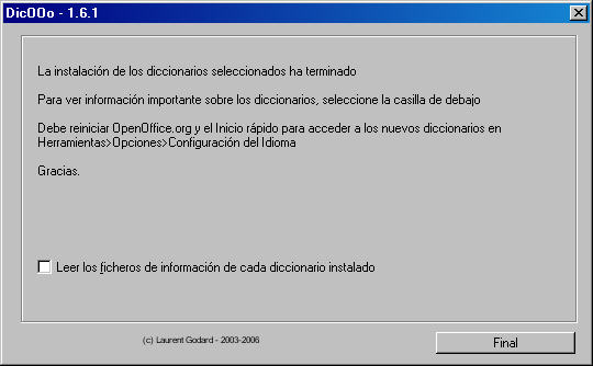 Para dar por terminada la instalación de los diccionarios hacemos clic en el botón Final. Ya sólo nos queda configurar OpenOffice para que utilice los diccionarios de español, como veremos en el próximo apartado. |