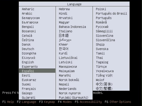 El proceso de instalación comienza eligiendo el idioma en el que se presentarán los diferentes mensajes que se mostrarán al usuario en la parte no gráfica del proceso de instalación. Ubuntu tiene soporte para una gran cantidad de idiomas. En nuestro caso seleccionaremos el idioma Español para la instalación como podemos ver en la siguiente figura.