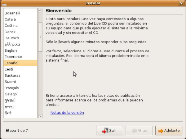 El proceso de instalación consta de 7 etapas. En la primera etapa seleccionamos el idioma del sistema final una vez instalado, tal y como se puede ver en la siguiente figura.