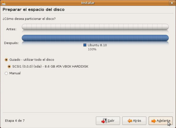 En nuestro caso hemos seleccionado la opción por defecto, es decir, definir una única partición que ocupe todo el espacio del disco duro.
